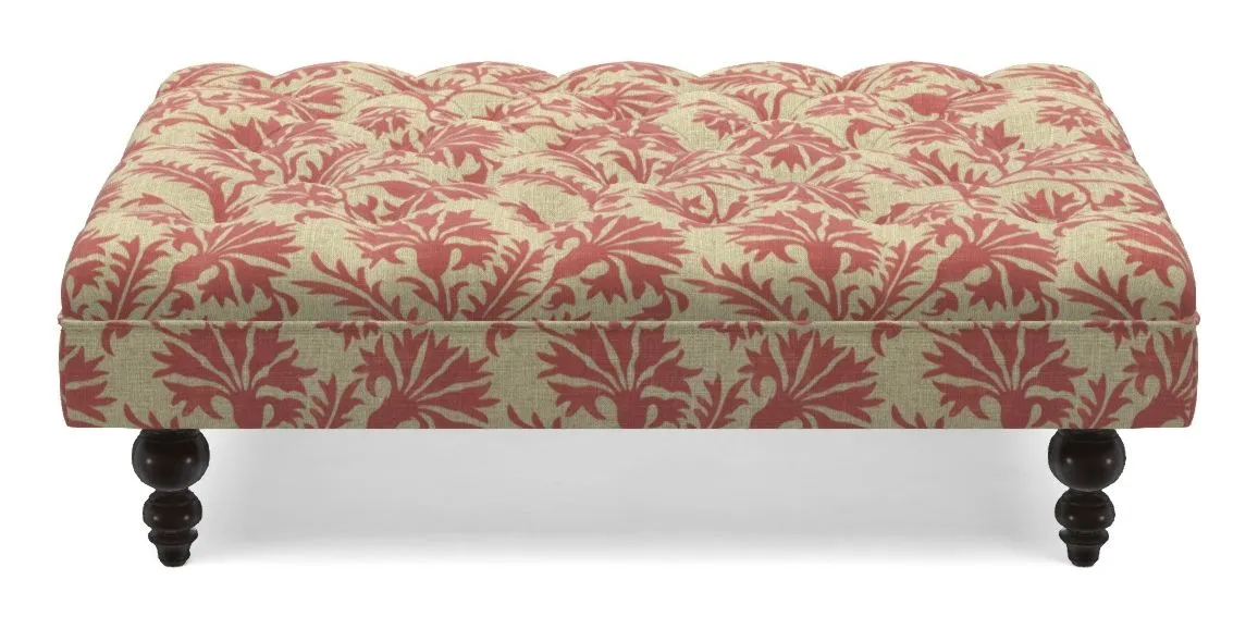 A traditionally styled, large, low rectangular footstool featuring classic buttoning and solid hardwood turned feet.
