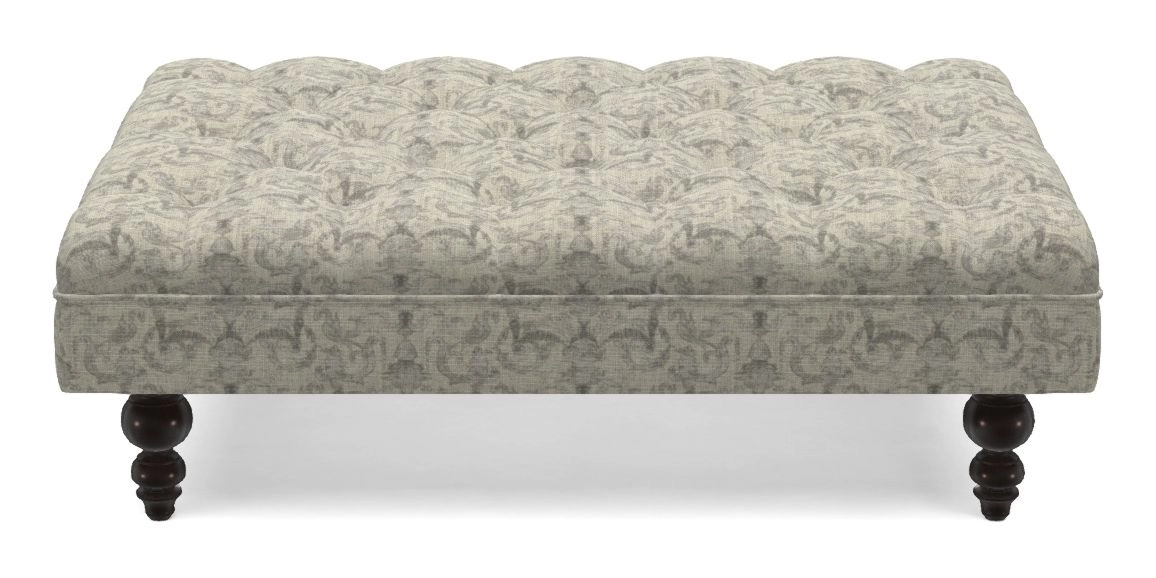 A traditionally styled, large, low rectangular footstool featuring classic buttoning and solid hardwood turned feet.