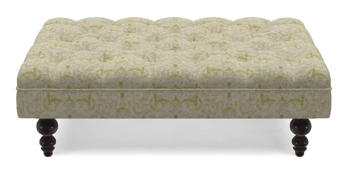 A traditionally styled, large, low rectangular footstool featuring classic buttoning and solid hardwood turned feet.