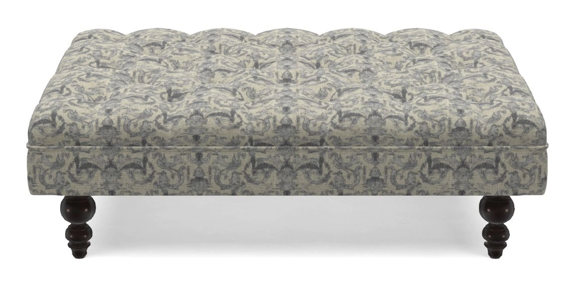 A traditionally styled, large, low rectangular footstool featuring classic buttoning and solid hardwood turned feet.