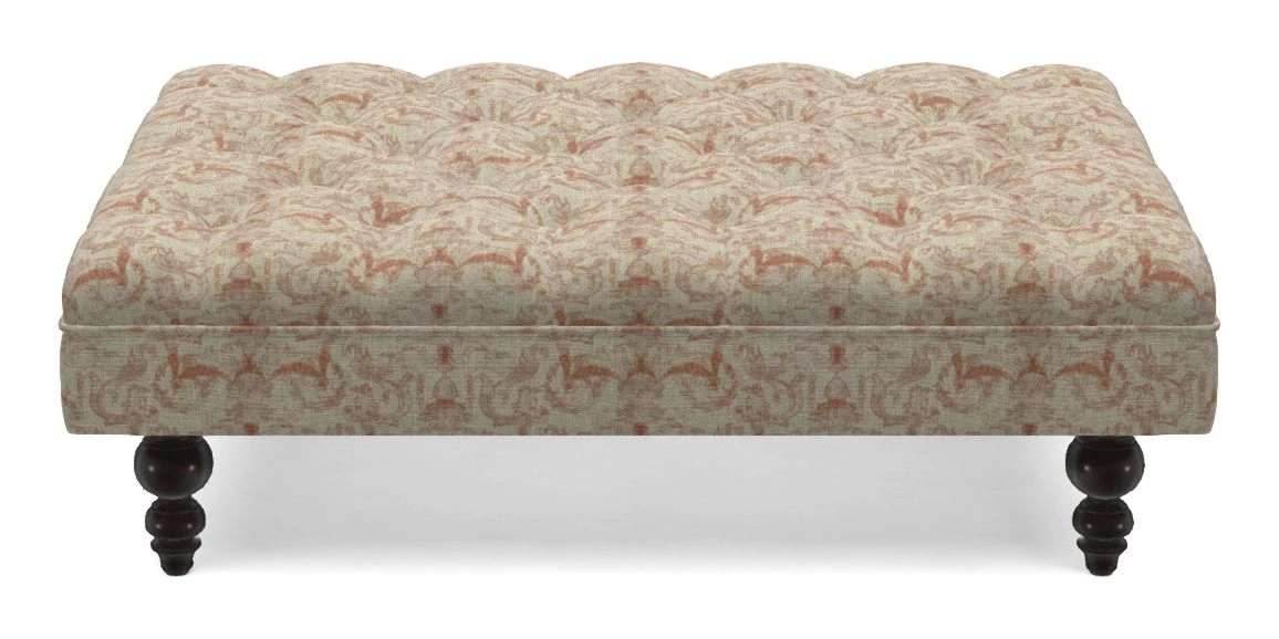 A traditionally styled, large, low rectangular footstool featuring classic buttoning and solid hardwood turned feet.
