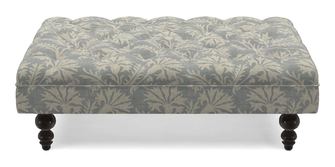 A traditionally styled, large, low rectangular footstool featuring classic buttoning and solid hardwood turned feet.