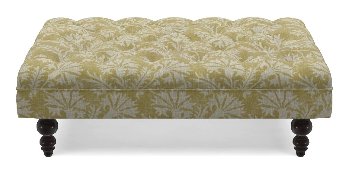 A traditionally styled, large, low rectangular footstool featuring classic buttoning and solid hardwood turned feet.