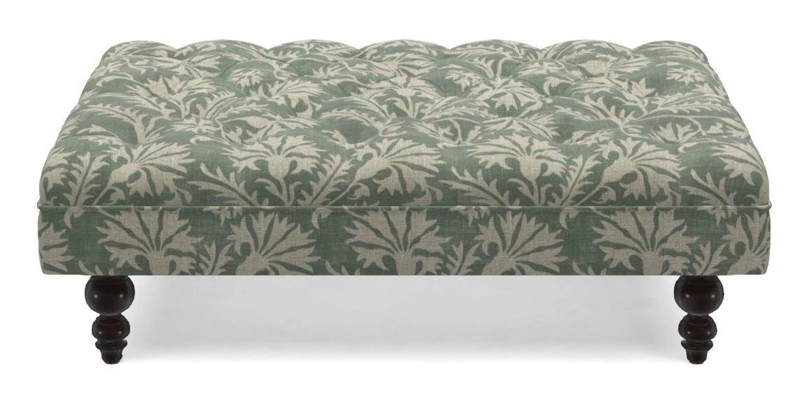 A traditionally styled, large, low rectangular footstool featuring classic buttoning and solid hardwood turned feet.