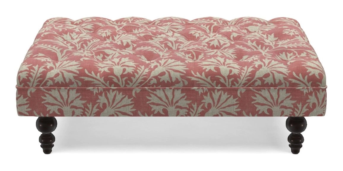 A traditionally styled, large, low rectangular footstool featuring classic buttoning and solid hardwood turned feet.