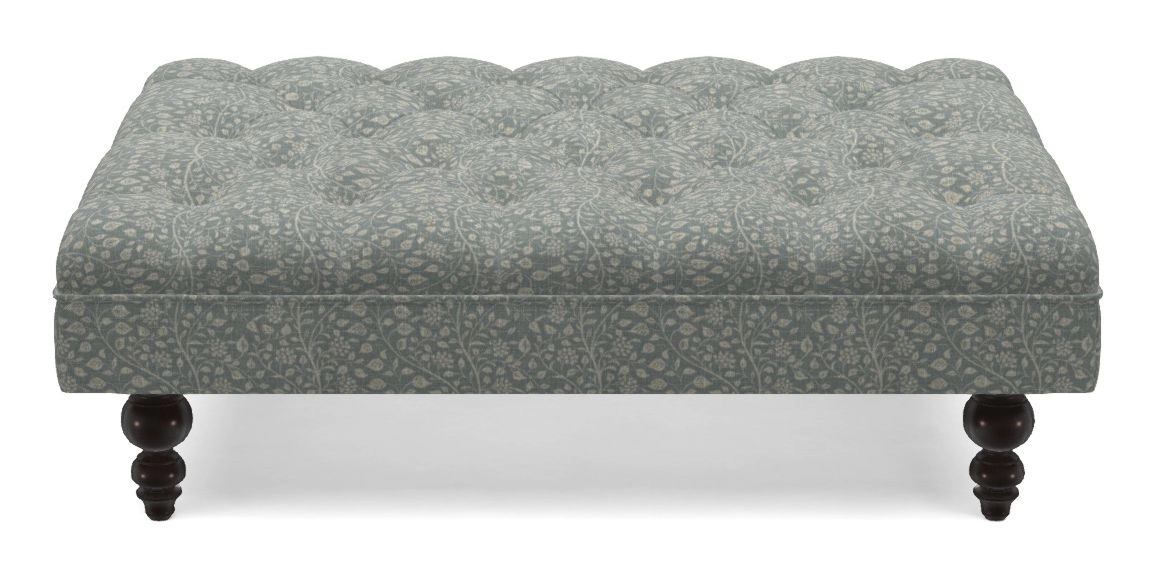 A traditionally styled, large, low rectangular footstool featuring classic buttoning and solid hardwood turned feet.