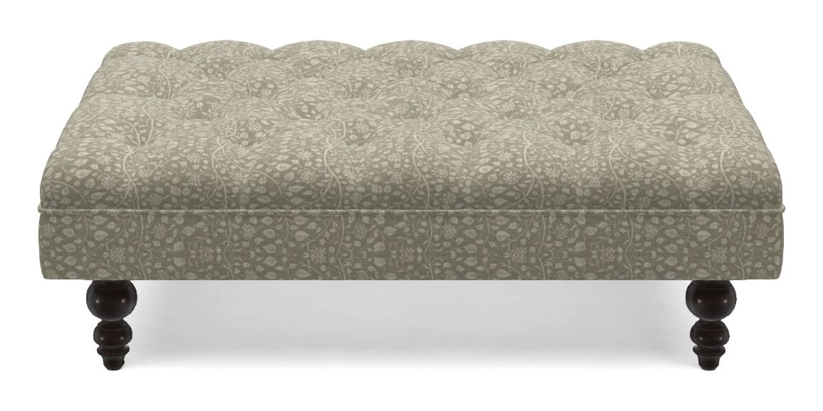 A traditionally styled, large, low rectangular footstool featuring classic buttoning and solid hardwood turned feet.