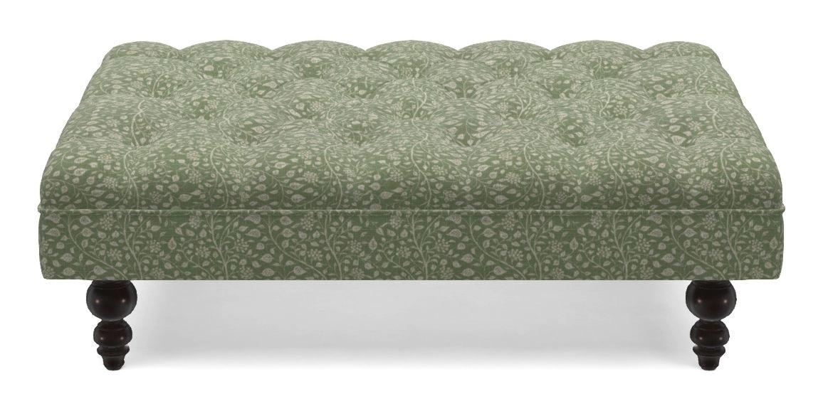 A traditionally styled, large, low rectangular footstool featuring classic buttoning and solid hardwood turned feet.
