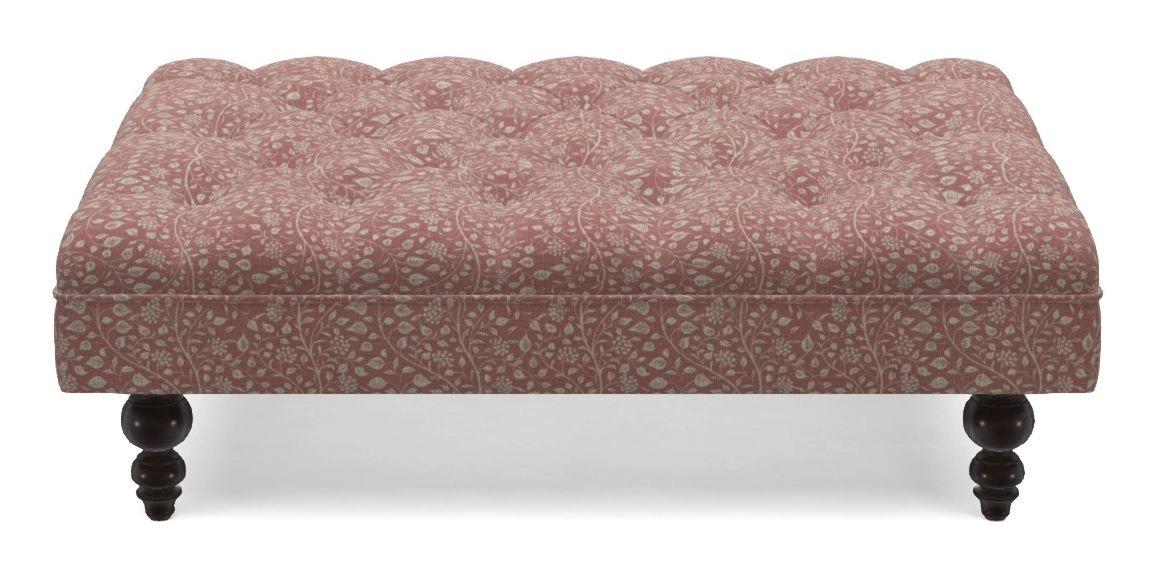 A traditionally styled, large, low rectangular footstool featuring classic buttoning and solid hardwood turned feet.