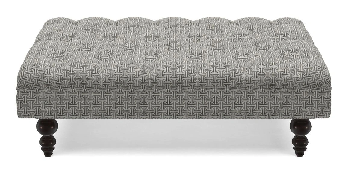 A traditionally styled, large, low rectangular footstool featuring classic buttoning and solid hardwood turned feet.