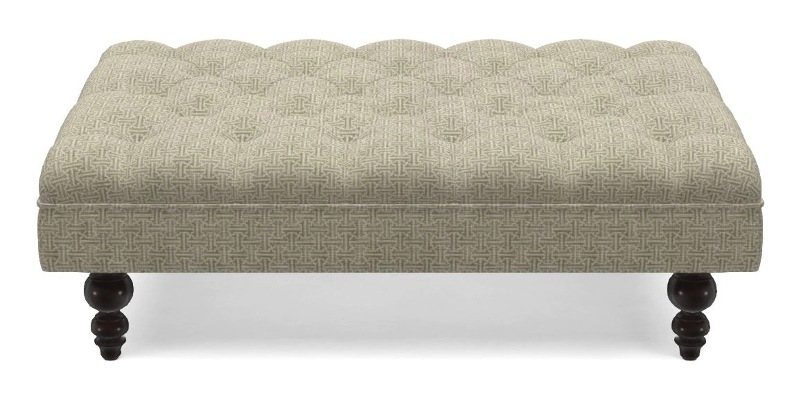 A traditionally styled, large, low rectangular footstool featuring classic buttoning and solid hardwood turned feet.