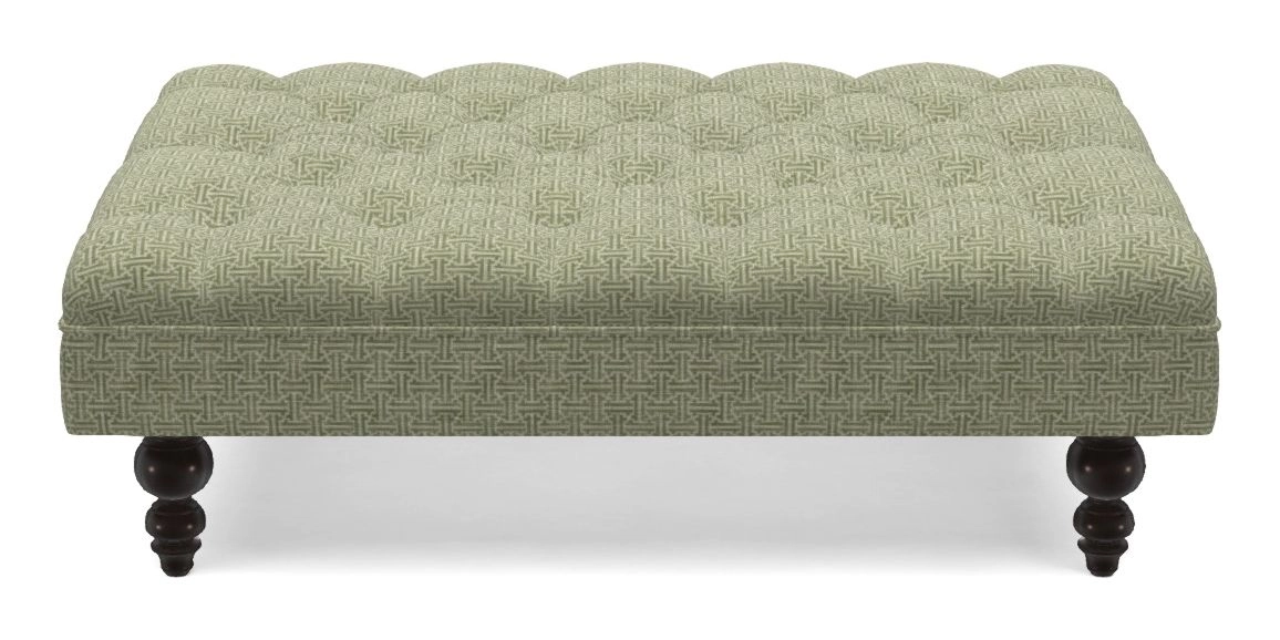A traditionally styled, large, low rectangular footstool featuring classic buttoning and solid hardwood turned feet.