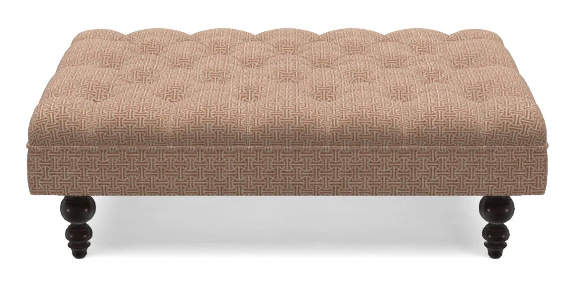 A traditionally styled, large, low rectangular footstool featuring classic buttoning and solid hardwood turned feet.