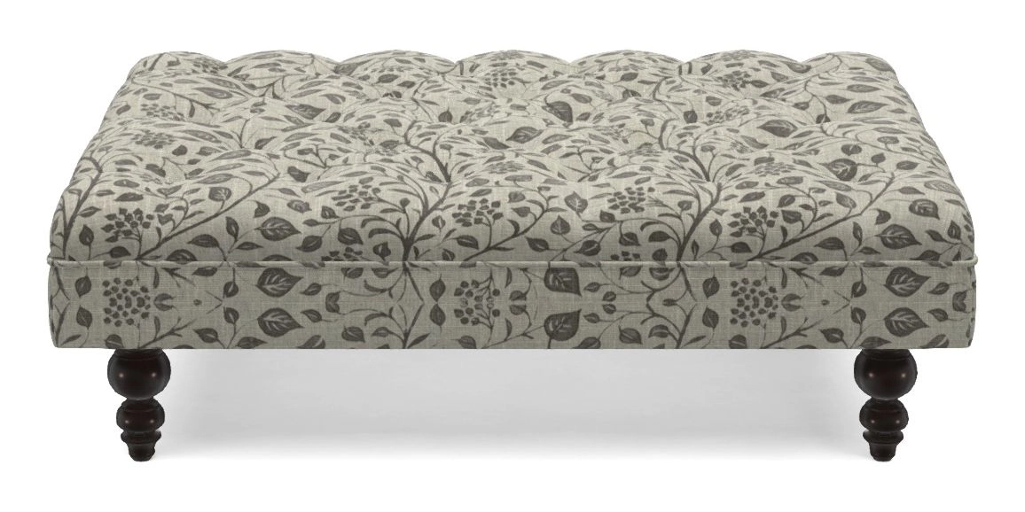 A traditionally styled, large, low rectangular footstool featuring classic buttoning and solid hardwood turned feet.