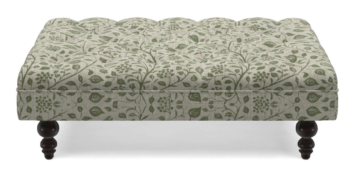 A traditionally styled, large, low rectangular footstool featuring classic buttoning and solid hardwood turned feet.