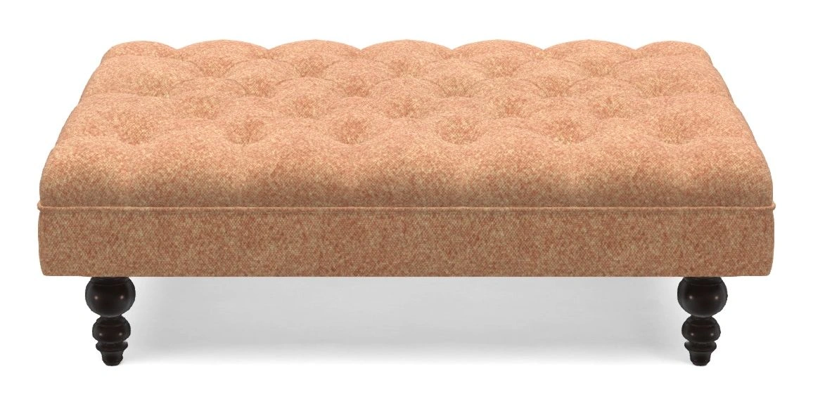 A traditionally styled, large, low rectangular footstool featuring classic buttoning and solid hardwood turned feet.