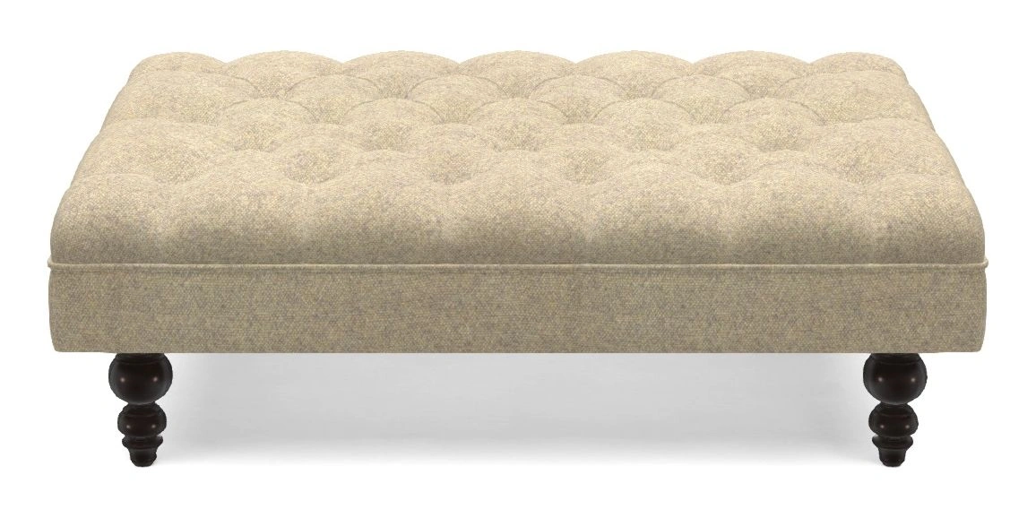 A traditionally styled, large, low rectangular footstool featuring classic buttoning and solid hardwood turned feet.