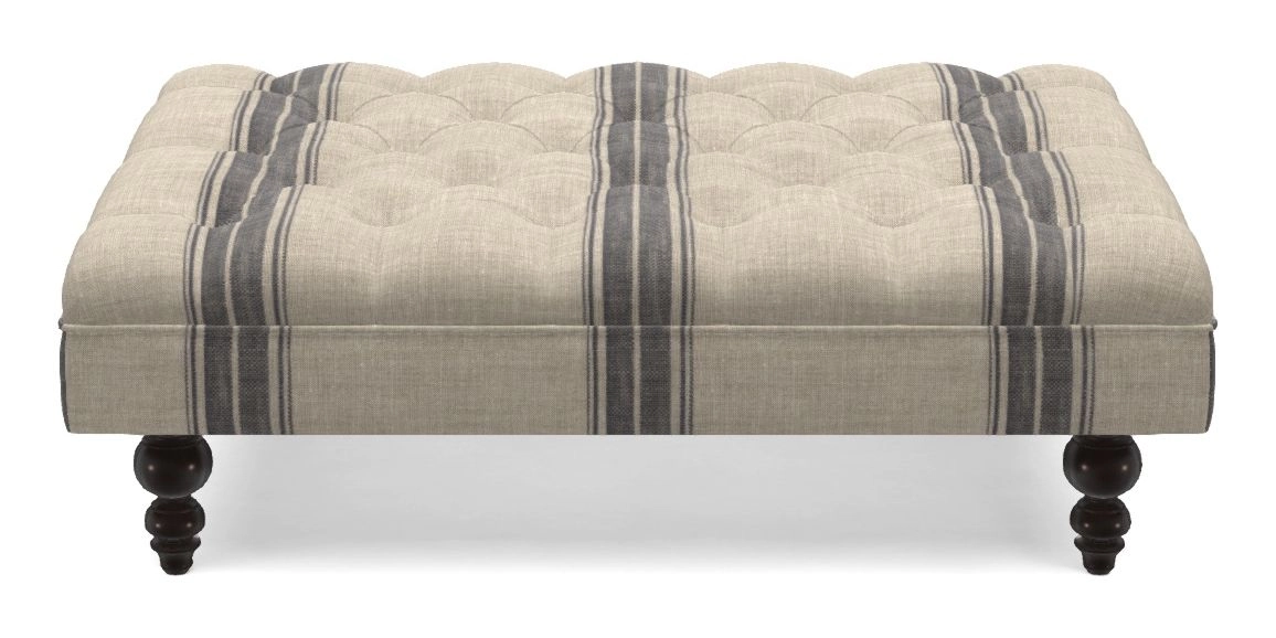 A traditionally styled, large, low rectangular footstool featuring classic buttoning and solid hardwood turned feet.