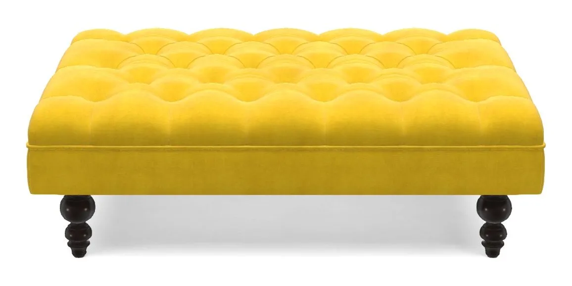 A traditionally styled, large, low rectangular footstool featuring classic buttoning and solid hardwood turned feet.