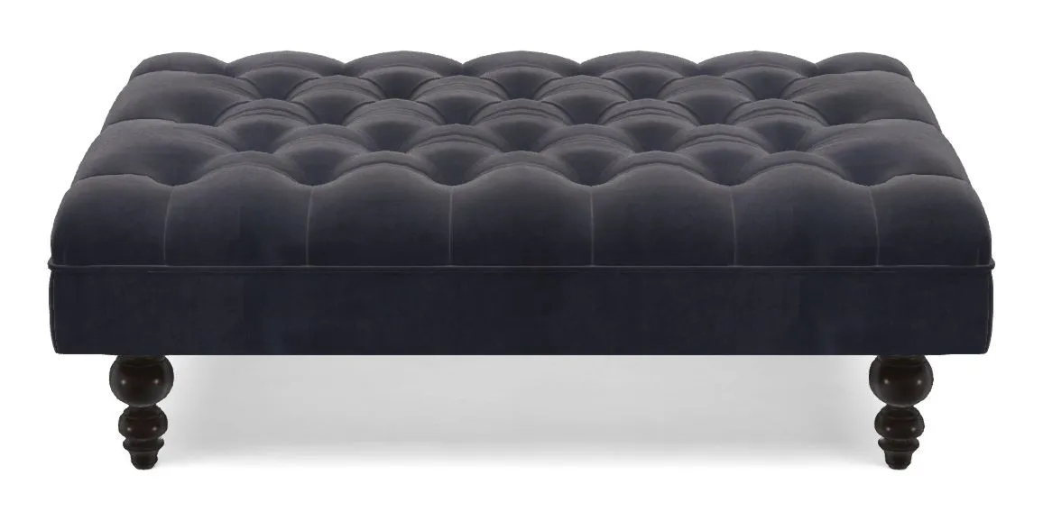 A traditionally styled, large, low rectangular footstool featuring classic buttoning and solid hardwood turned feet.