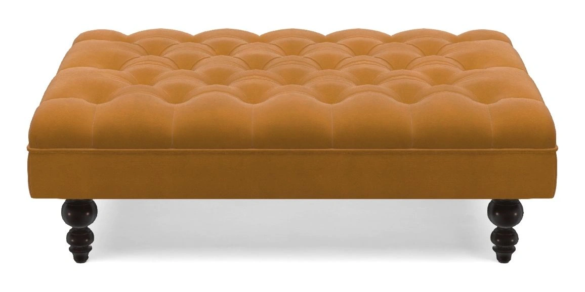 A traditionally styled, large, low rectangular footstool featuring classic buttoning and solid hardwood turned feet.