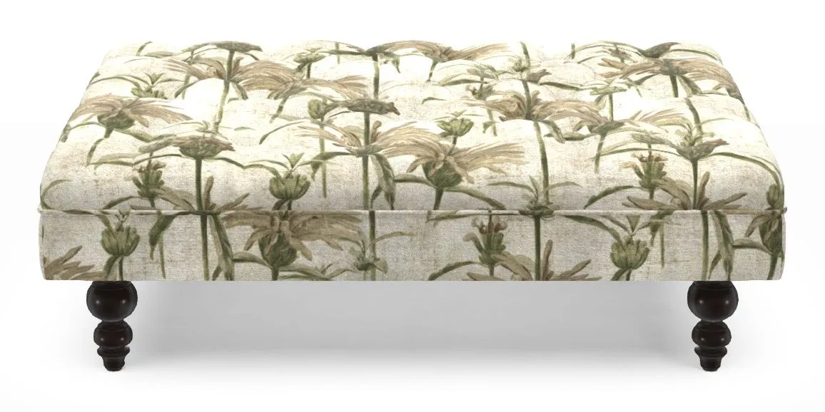 A traditionally styled, large, low rectangular footstool featuring classic buttoning and solid hardwood turned feet.