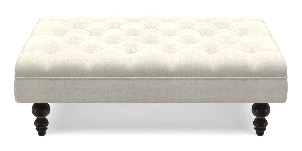 A traditionally styled, large, low rectangular footstool featuring classic buttoning and solid hardwood turned feet.