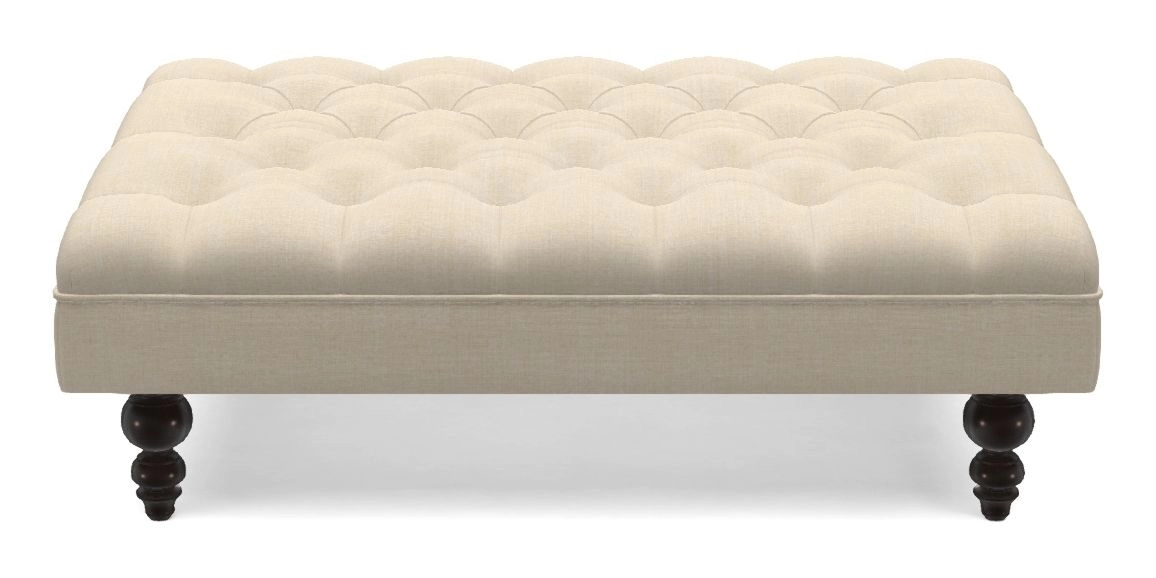A traditionally styled, large, low rectangular footstool featuring classic buttoning and solid hardwood turned feet.