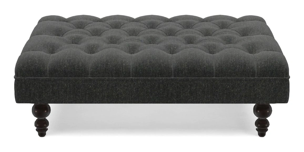 A traditionally styled, large, low rectangular footstool featuring classic buttoning and solid hardwood turned feet.