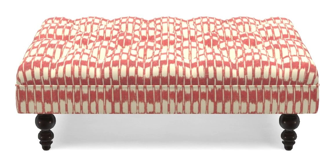 A traditionally styled, large, low rectangular footstool featuring classic buttoning and solid hardwood turned feet.