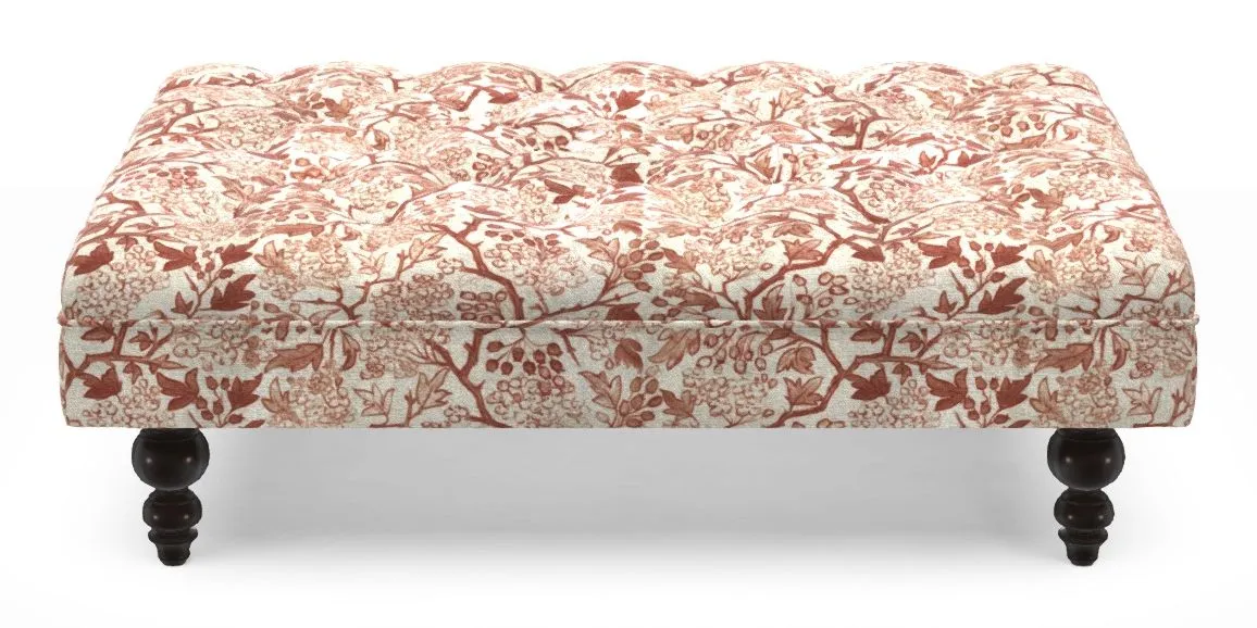 A traditionally styled, large, low rectangular footstool featuring classic buttoning and solid hardwood turned feet.