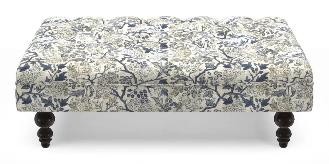A traditionally styled, large, low rectangular footstool featuring classic buttoning and solid hardwood turned feet.