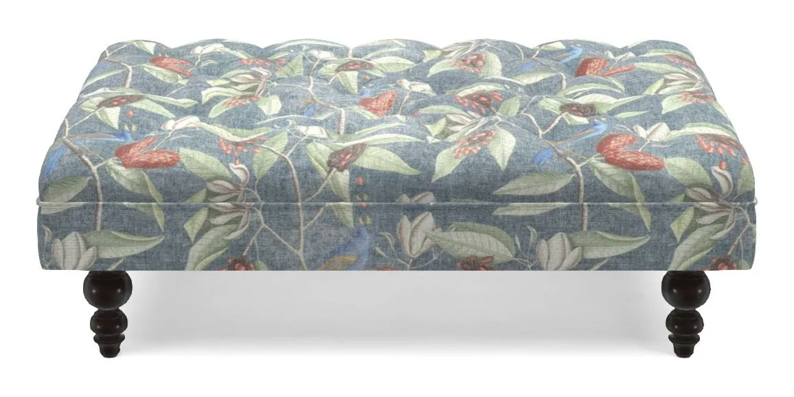 A traditionally styled, large, low rectangular footstool featuring classic buttoning and solid hardwood turned feet.