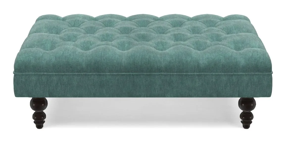 A traditionally styled, large, low rectangular footstool featuring classic buttoning and solid hardwood turned feet.