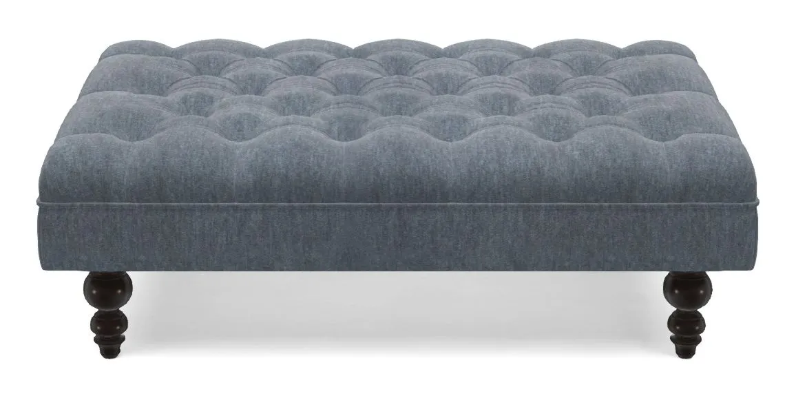 A traditionally styled, large, low rectangular footstool featuring classic buttoning and solid hardwood turned feet.