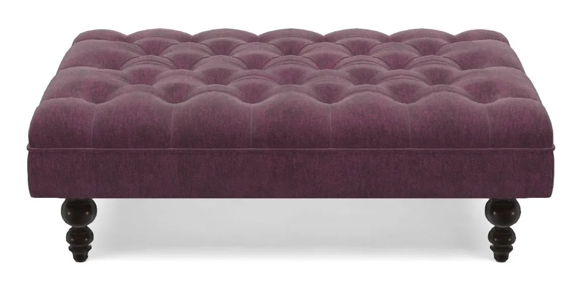 A traditionally styled, large, low rectangular footstool featuring classic buttoning and solid hardwood turned feet.