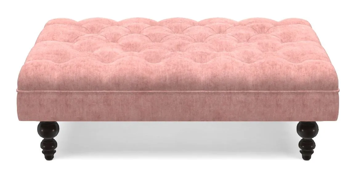 A traditionally styled, large, low rectangular footstool featuring classic buttoning and solid hardwood turned feet.
