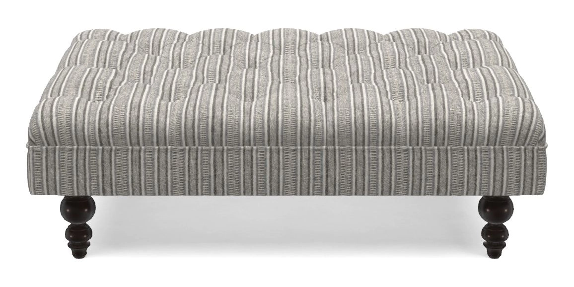 A traditionally styled, large, low rectangular footstool featuring classic buttoning and solid hardwood turned feet.