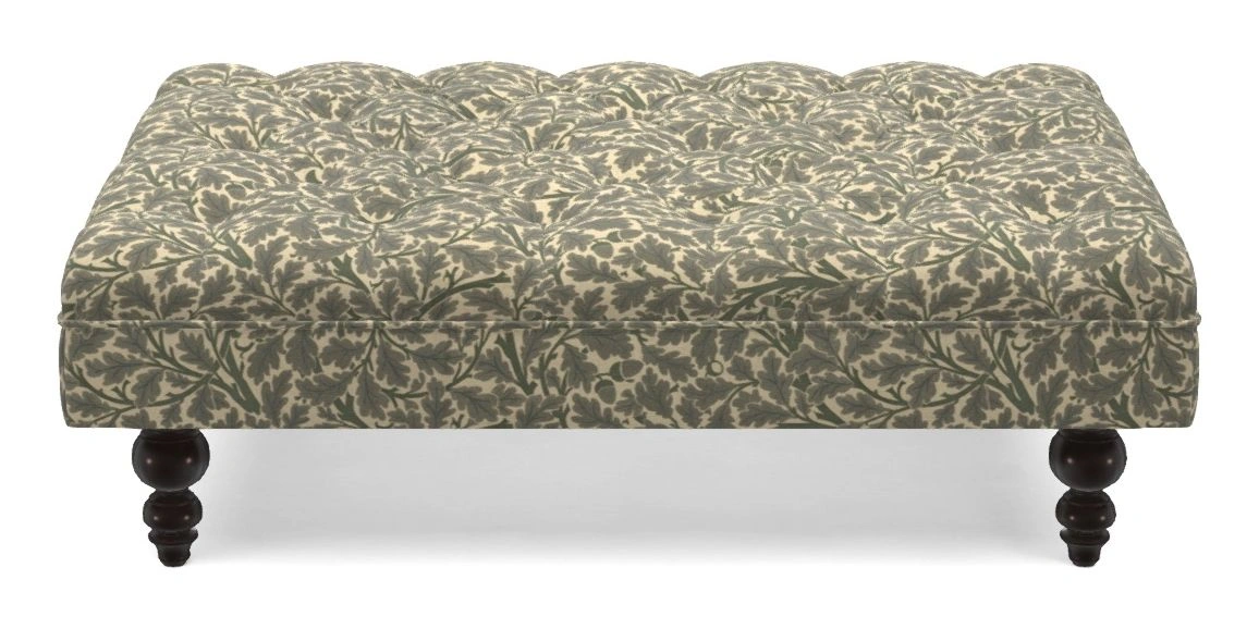 A traditionally styled, large, low rectangular footstool featuring classic buttoning and solid hardwood turned feet.