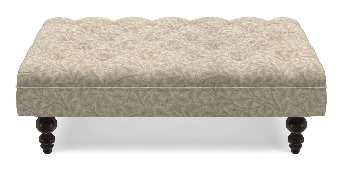 A traditionally styled, large, low rectangular footstool featuring classic buttoning and solid hardwood turned feet.