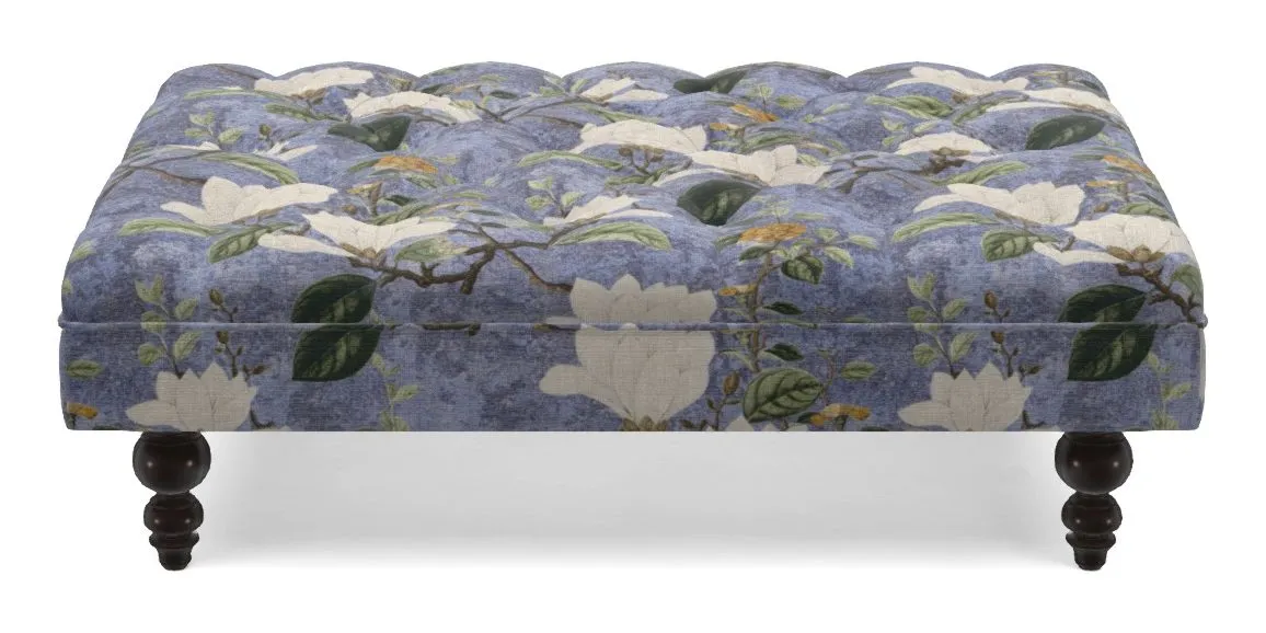 A traditionally styled, large, low rectangular footstool featuring classic buttoning and solid hardwood turned feet.