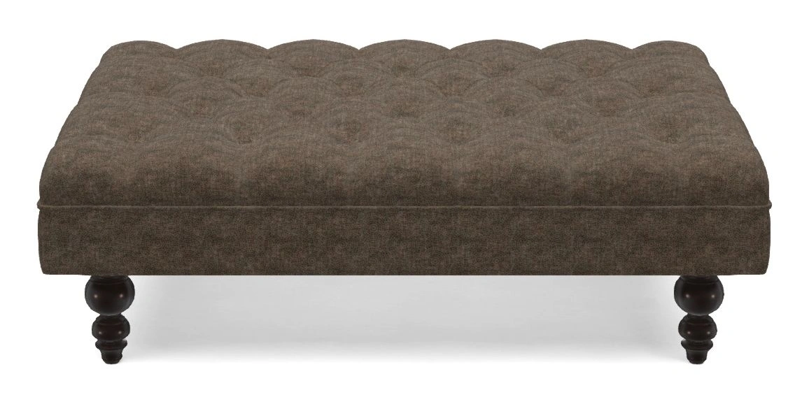 A traditionally styled, large, low rectangular footstool featuring classic buttoning and solid hardwood turned feet.