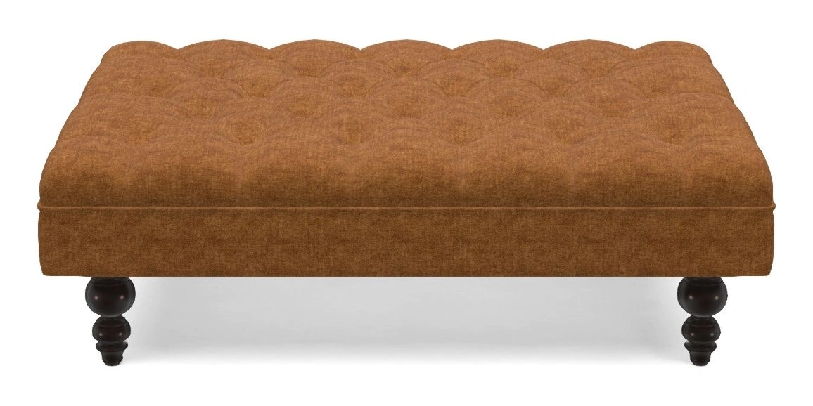 A traditionally styled, large, low rectangular footstool featuring classic buttoning and solid hardwood turned feet.
