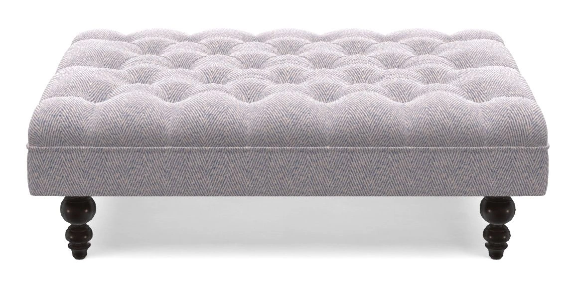 A traditionally styled, large, low rectangular footstool featuring classic buttoning and solid hardwood turned feet.