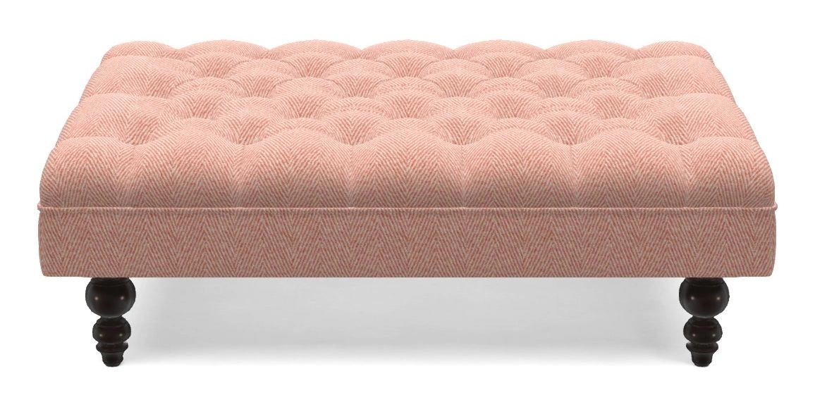 A traditionally styled, large, low rectangular footstool featuring classic buttoning and solid hardwood turned feet.
