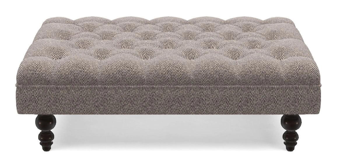 A traditionally styled, large, low rectangular footstool featuring classic buttoning and solid hardwood turned feet.
