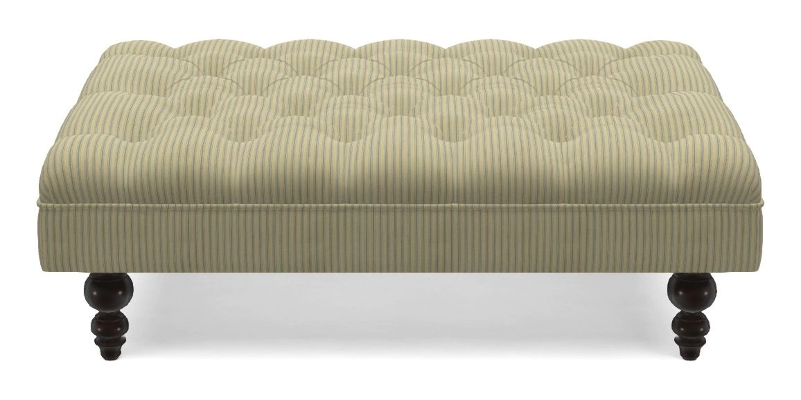 A traditionally styled, large, low rectangular footstool featuring classic buttoning and solid hardwood turned feet.