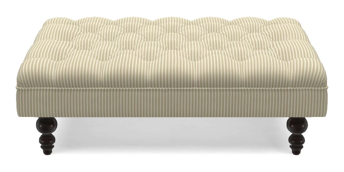 A traditionally styled, large, low rectangular footstool featuring classic buttoning and solid hardwood turned feet.