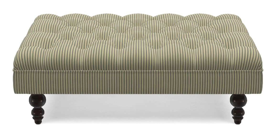 A traditionally styled, large, low rectangular footstool featuring classic buttoning and solid hardwood turned feet.