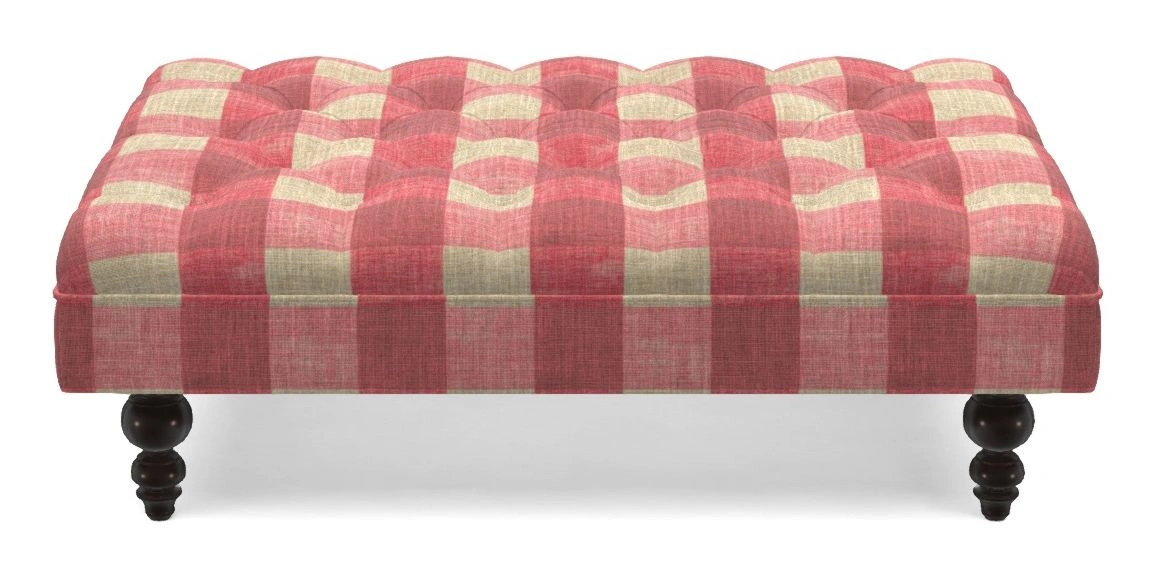 A traditionally styled, large, low rectangular footstool featuring classic buttoning and solid hardwood turned feet.
